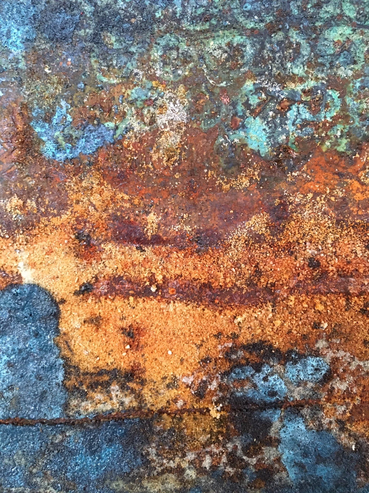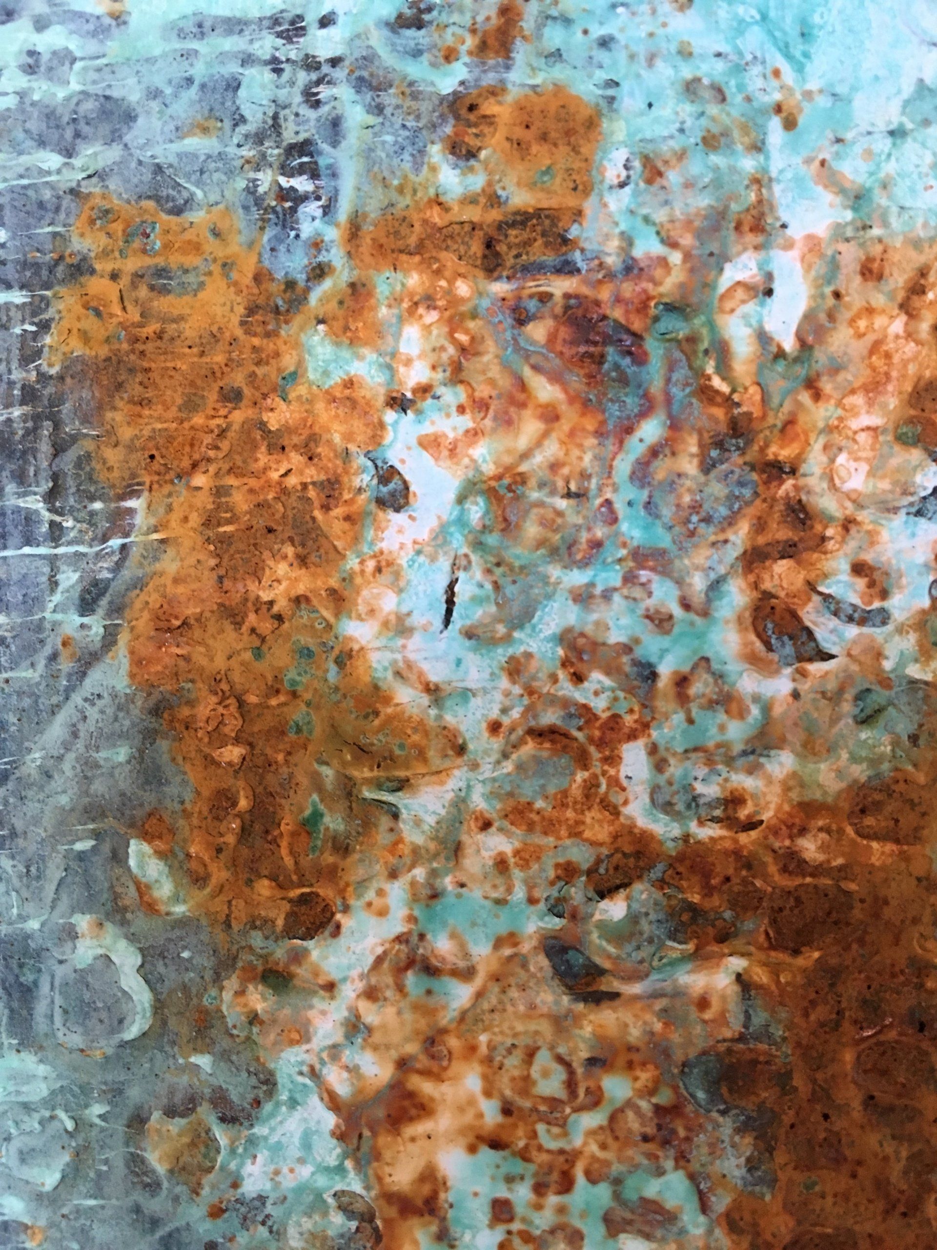 Die Rost- und Patinawerke darunter werden durch verschiedene Oxidationstechniken mit Eisenpulver, Eisenspänen, Sand, Kupferpartikeln, Messing- und Bronzespänen, Silber, Gold, Kaffeepulver, Salz, Glaspartikeln, Essig und verschiedenen Rostlösungen erzeugt. Oft setze ich die Arbeiten dem Wetter aus und beobachte aufmerksam die langsame Bildung der Patina und die sanfte Entwicklung des Rostes mit seinen verschiedenen Stadien der Korrosion. Die entstehenden Farbtöne sind abhängig von der Art des verwendeten Metalls und der Oxidationslösung mit der ich arbeite.