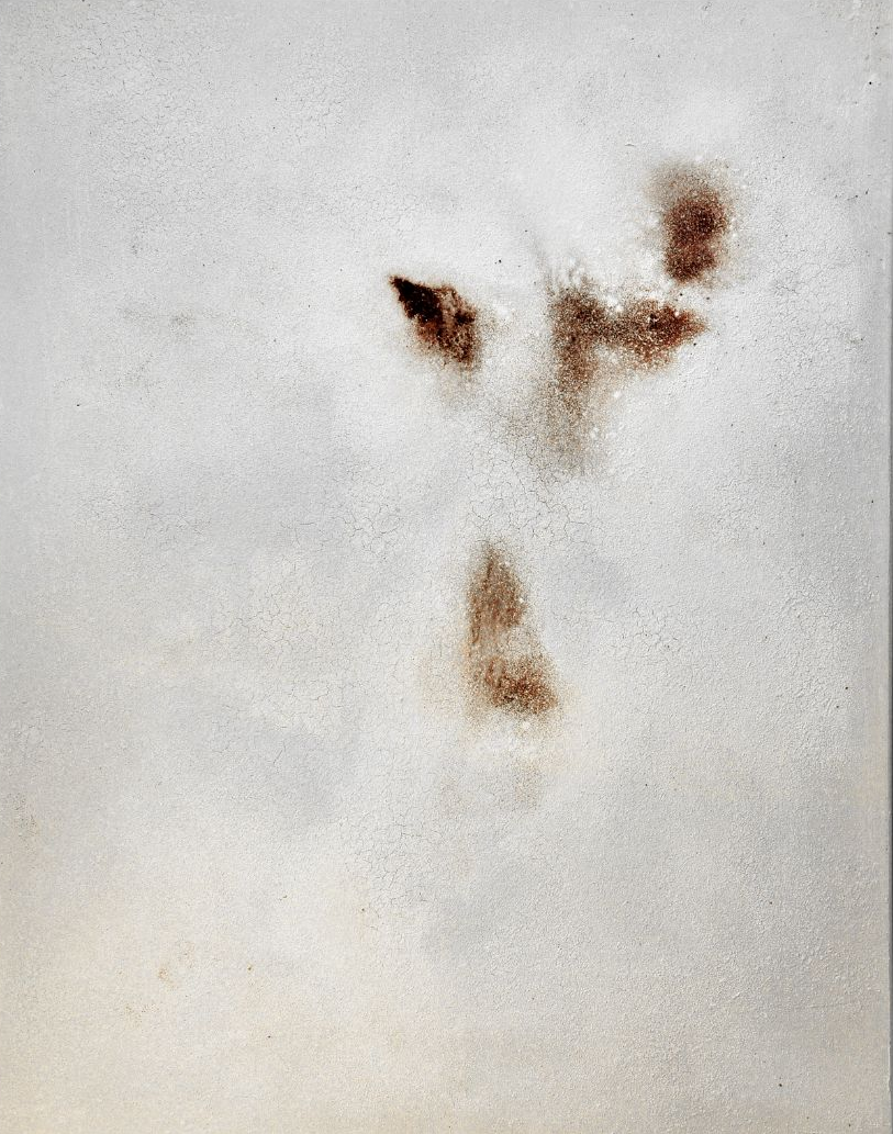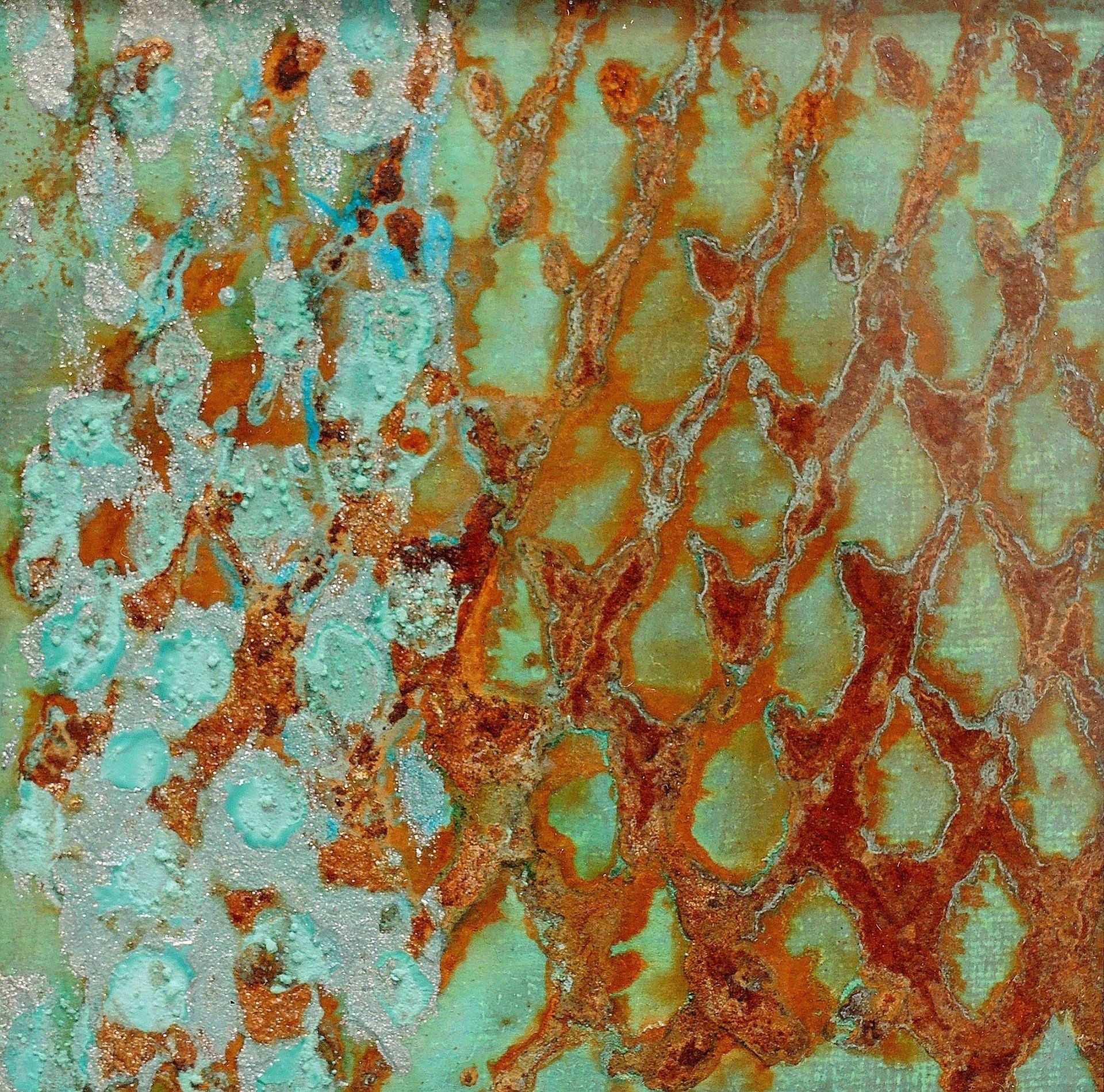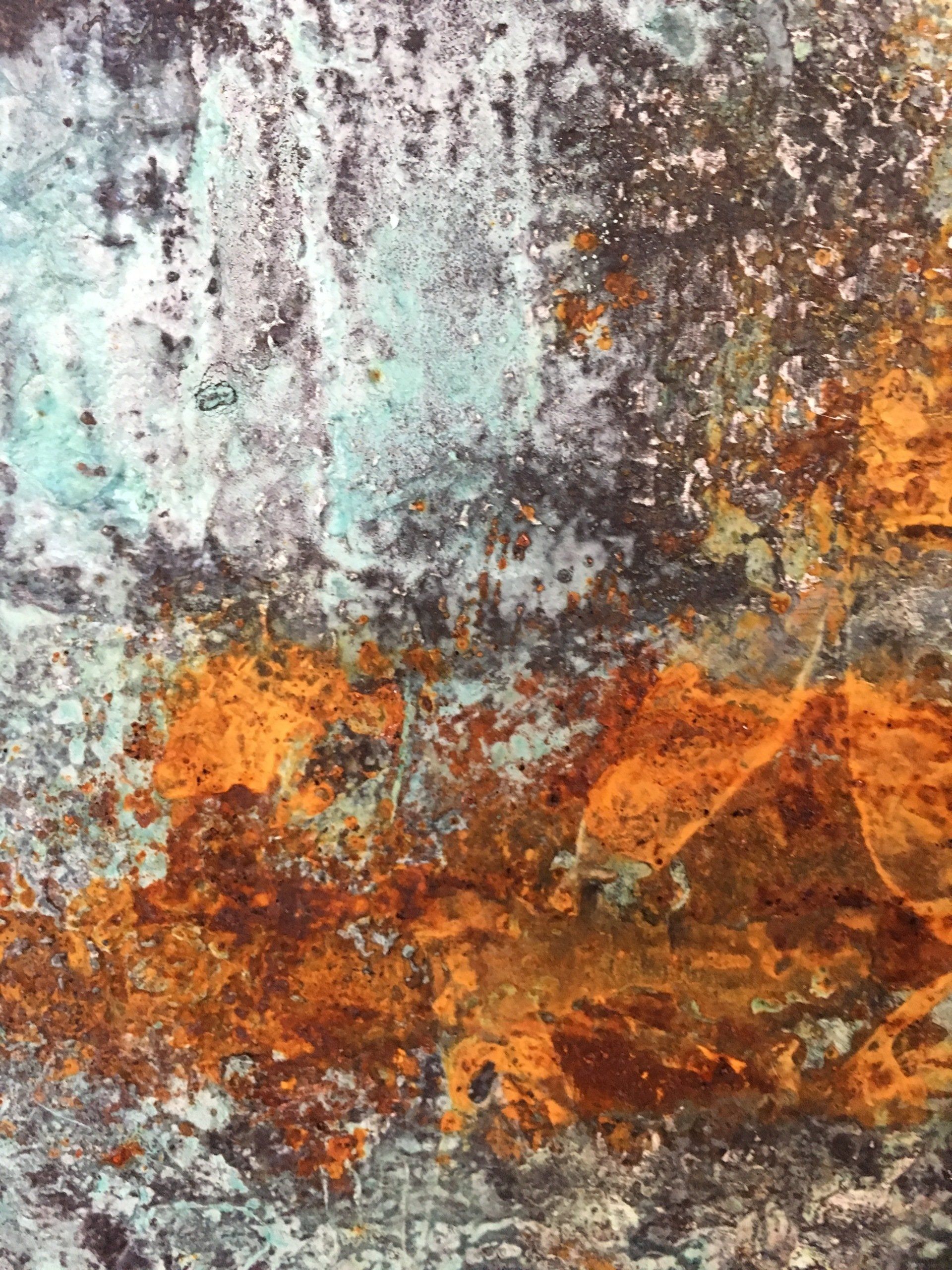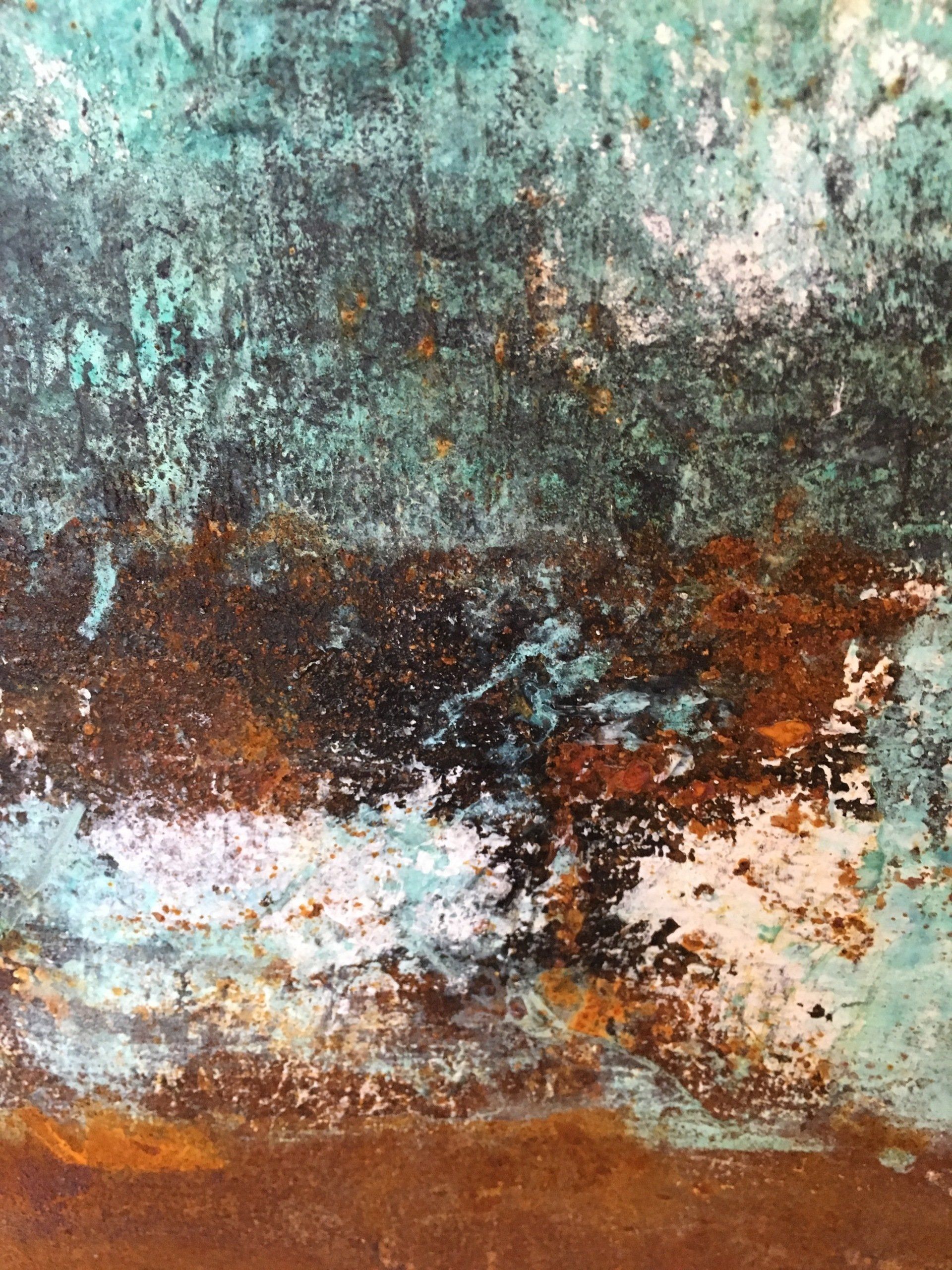 Die Rost- und Patinawerke darunter werden durch verschiedene Oxidationstechniken mit Eisenpulver, Eisenspänen, Sand, Kupferpartikeln, Messing- und Bronzespänen, Silber, Gold, Kaffeepulver, Salz, Glaspartikeln, Essig und verschiedenen Rostlösungen erzeugt. Oft setze ich die Arbeiten dem Wetter aus und beobachte aufmerksam die langsame Bildung der Patina und die sanfte Entwicklung des Rostes mit seinen verschiedenen Stadien der Korrosion. Die entstehenden Farbtöne sind abhängig von der Art des verwendeten Metalls und der Oxidationslösung mit der ich arbeite.