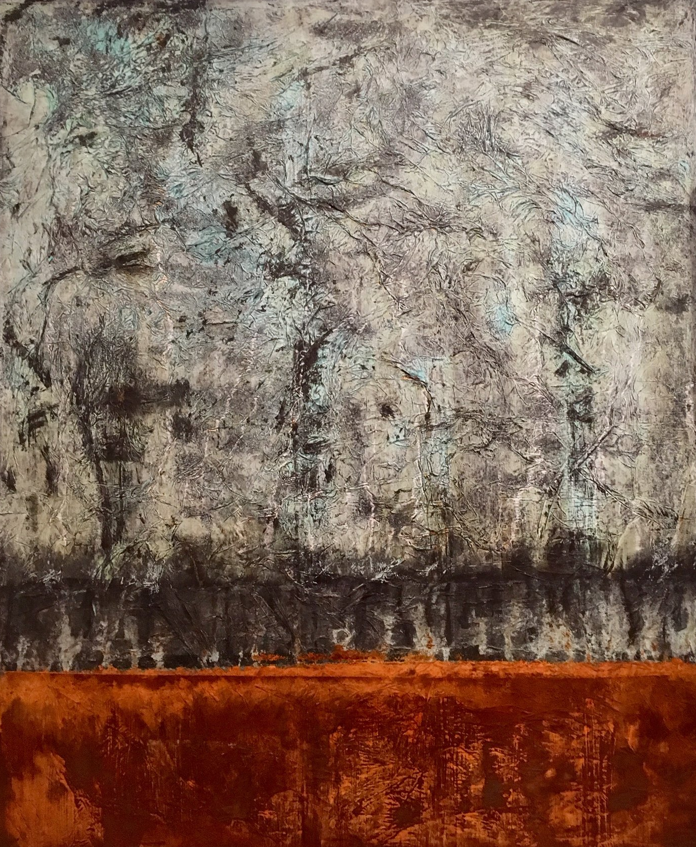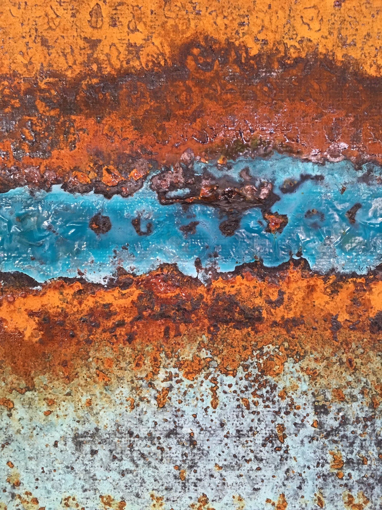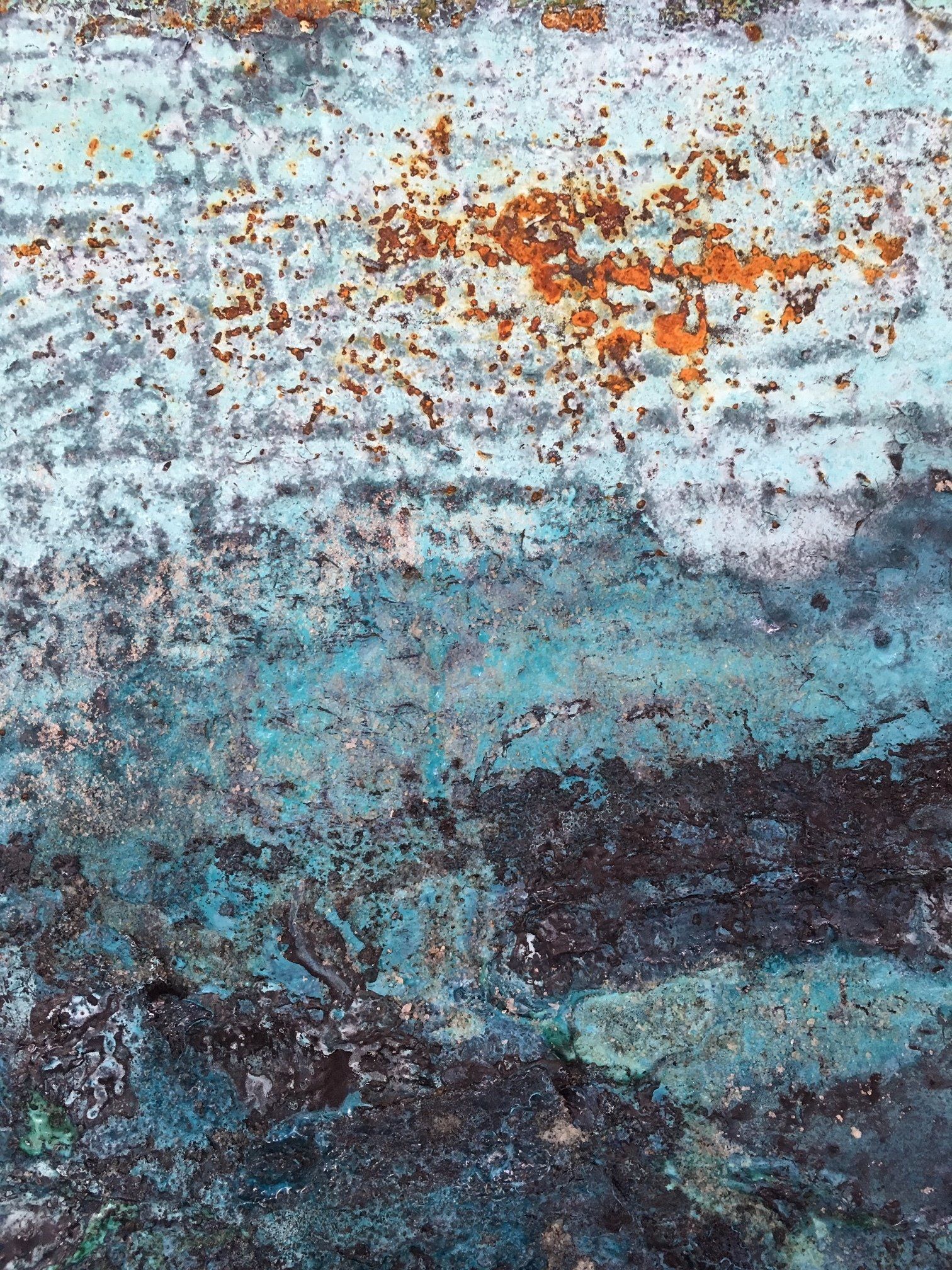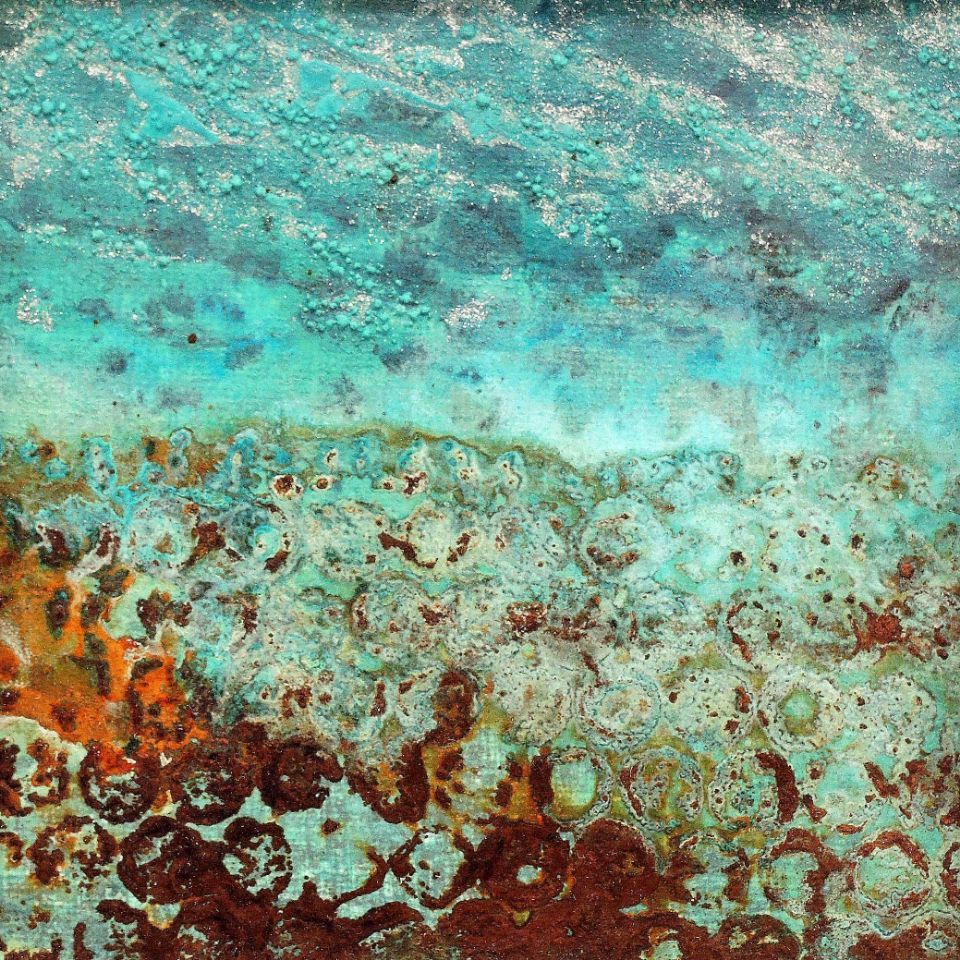 Die Rost- und Patinawerke darunter werden durch verschiedene Oxidationstechniken mit Eisenpulver, Eisenspänen, Sand, Kupferpartikeln, Messing- und Bronzespänen, Silber, Gold, Kaffeepulver, Salz, Glaspartikeln, Essig und verschiedenen Rostlösungen erzeugt. Oft setze ich die Arbeiten dem Wetter aus und beobachte aufmerksam die langsame Bildung der Patina und die sanfte Entwicklung des Rostes mit seinen verschiedenen Stadien der Korrosion. Die entstehenden Farbtöne sind abhängig von der Art des verwendeten Metalls und der Oxidationslösung mit der ich arbeite.