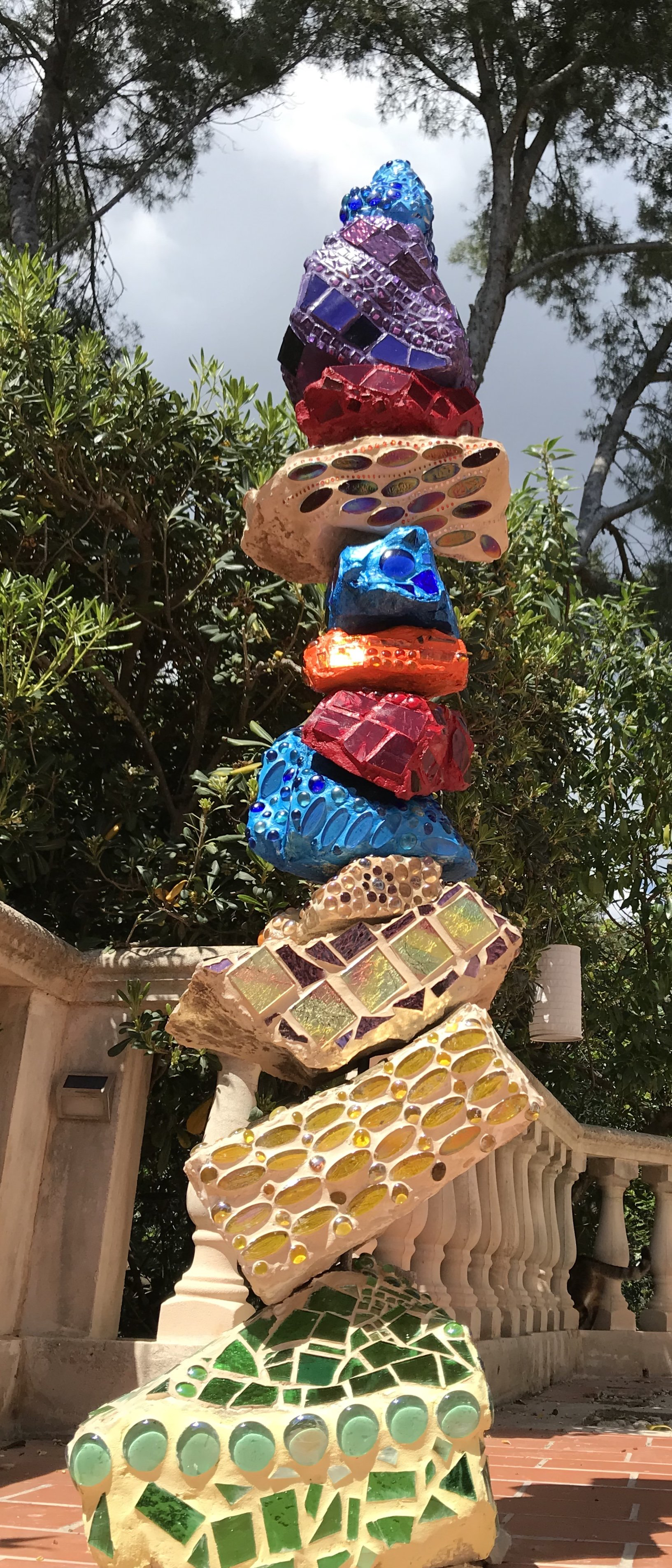 Die Skulpturen bestehen aus einer Beton Struktur oder aus aufeinander gestapelten Steinen, die an einer im Boden verankerten Eisenstange befestigt sind. Ich arbeite mit farbigem Spiegelglas, Spiegelmosaik, Perlmutt-Mosaik, Tiffany Glas, Glasmosaik, Eis-Glas Mosaik, Glasnuggets, Keramikmosaik, Bruchmosaik und Steinmosaik.